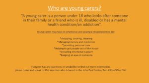 We are currently working towards our Young Carers award, to ensure we have identified all young carers within our school and are able to offer them the support required. If you think you live with a young carer please email flint.h@allsaints.notts.sch.uk with their full name.
